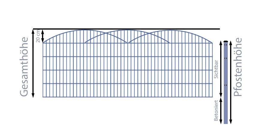 Alle Zaunpfosten vom Doppelstab-Schmuckzaun 3-er Bogen Komplett-Set mit Abdeckleisten / Anthrazit / 201cm hoch / 57,5m lang werden immer mit einer Überlänge zum Einbetonieren geliefert. Die genaue Überlänge zum Einbetonieren der jeweiligen Pfosten können Sie der Beschreibung entnehmen.