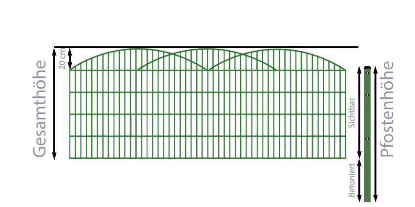 Alle Zaunpfosten vom Doppelstab-Schmuckzaun 3-er Bogen Komplett-Set mit Abdeckleisten / Grün / 201cm hoch / 85m lang werden immer mit einer Überlänge zum Einbetonieren geliefert. Die genaue Überlänge zum Einbetonieren der jeweiligen Pfosten können Sie der Beschreibung entnehmen.