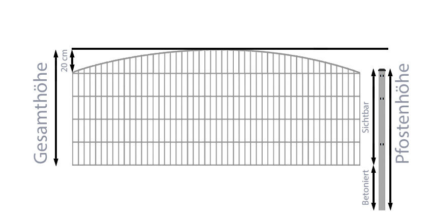 Das Einbetonieren der Zaunpfosten sorgt für die richtige Stabilität des Stabmattenzauns, daher sind die mitgelieferten Zaunpfosten auch immer wesentlich länger, als die Höhe der Doppelstabmatten - das ist auch in dem Doppelstab-Schmuckzaun Rundbogen-Dekor Komplett-Set / Verzinkt / 201 cm hoch / 100 m lang so. Bspw. sind die Zaunpfosten für einen 103cm hohen Stabmattenzaun insgesamt 150cm lang, so dass diese bis zu einer Tiefe von ca. 40cm einbetoniert werden können. Die Zaunpfosten für Doppelstabmattenzäune der Höhe 203cm sind sogar 260cm lang, entsprechend können diese noch tiefer einbetoniert werden. Wir empfehlen, diese Überlänge auch immer zum Einbetonieren zu nutzen, um einen optimale Stabilität für Ihren Gartenzaun zu gewährleisten.