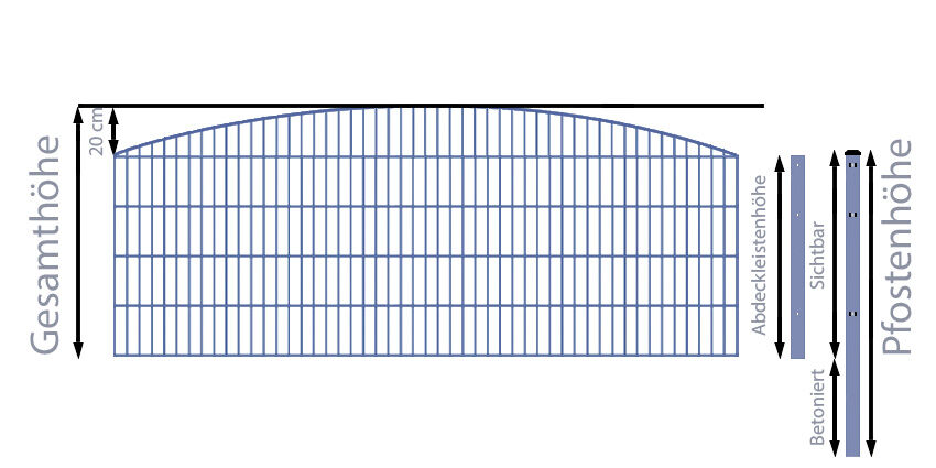Das Einbetonieren der Zaunpfosten sorgt für die richtige Stabilität des Stabmattenzauns, daher sind die mitgelieferten Zaunpfosten auch immer wesentlich länger, als die Höhe der Doppelstabmatten - das ist auch in dem Doppelstab-Schmuckzaun Rundbogen-Dekor Komplett-Set mit Abdeckleisten / Anthrazit / 101 cm hoch / 87,5 m lang so. Bspw. sind die Zaunpfosten für einen 103cm hohen Stabmattenzaun insgesamt 150cm lang, so dass diese bis zu einer Tiefe von ca. 40cm einbetoniert werden können. Die Zaunpfosten für Doppelstabmattenzäune der Höhe 203cm sind sogar 260cm lang, entsprechend können diese noch tiefer einbetoniert werden. Wir empfehlen, diese Überlänge auch immer zum Einbetonieren zu nutzen, um einen optimale Stabilität für Ihren Gartenzaun zu gewährleisten.
