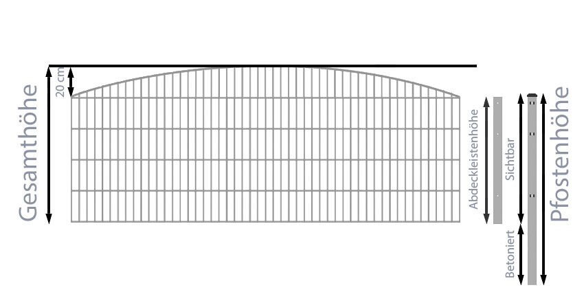 Das Einbetonieren der Zaunpfosten sorgt für die richtige Stabilität des Stabmattenzauns, daher sind die mitgelieferten Zaunpfosten auch immer wesentlich länger, als die Höhe der Doppelstabmatten - das ist auch in dem Doppelstab-Schmuckzaun Rundbogen-Dekor Komplett-Set mit Abdeckleisten / Verzinkt / 161 cm hoch / 5 m lang so. Bspw. sind die Zaunpfosten für einen 103cm hohen Stabmattenzaun insgesamt 150cm lang, so dass diese bis zu einer Tiefe von ca. 40cm einbetoniert werden können. Die Zaunpfosten für Doppelstabmattenzäune der Höhe 203cm sind sogar 260cm lang, entsprechend können diese noch tiefer einbetoniert werden. Wir empfehlen, diese Überlänge auch immer zum Einbetonieren zu nutzen, um einen optimale Stabilität für Ihren Gartenzaun zu gewährleisten.