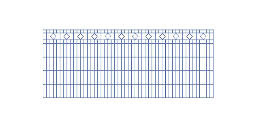Der obere Schmuckbereich dieses Gartenzauns ist in regelmäßigen Abständen mit Rauten versehen und setzt damit ein optisches Highlight für Ihre neue Garteneinfriedung, so dass man sich mit diesem Schmuckzaun dezent von den sonst häufig zu findenden normalen Doppelstabmattenzäunen absetzen kann. Das unterstreicht den individuellen Charakter, wertet das gesamte Grundstück auf und ist dennoch klassisch und keinem Trend unterworfen.