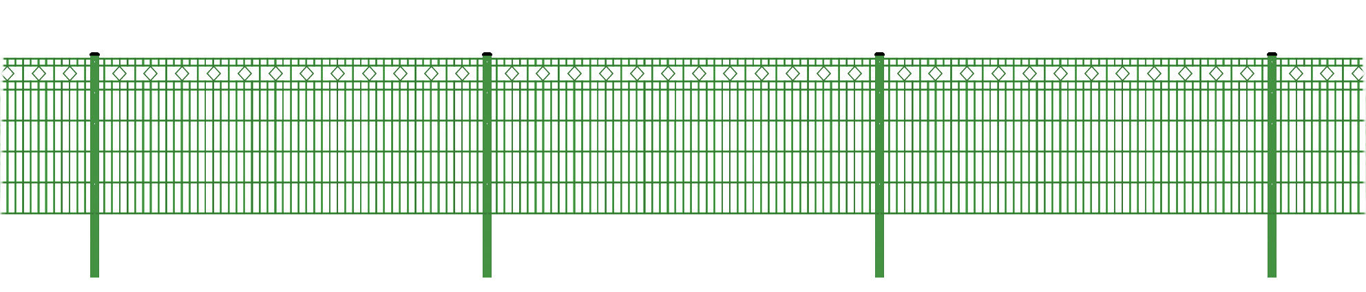 Mit diesem Doppelstabmatten-Schmuckzaun Diamant / Raute Komplett-Set mit Abdeckleisten / Grün / 141cm hoch / 27,5m lang erhalten Sie 11 Dekor-Doppelstabmattenzaunfelder, die aus robuster Doppelstabmatte (Stärke 6 / 6 / 6 mm) produziert werden und mit einem Rauten-Dekor abschließen. Die einzelnen Matten haben einen Gesamthöhe von 141 cm, wobei der obere Teil mit dem Dekor 20cm hoch ist, der restliche Zaun ist 121 cm hoch. Jede Schmuckzaun-Matte aus diesem Komplett-Set ist 250 cm lang.