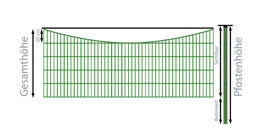 Alle Zaunpfosten vom Doppelstabmatten-Schmuckzaun Bogen konvex Komplett-Set / Grün / 101cm hoch / 50m lang werden immer mit einer Überlänge zum Einbetonieren geliefert. Die genaue Überlänge zum Einbetonieren der jeweiligen Pfosten können Sie der Beschreibung entnehmen.