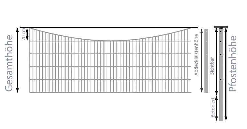 Das Doppelstabmatten-Schmuckzaun Bogen konkav Komplett-Set mit Abdeckleisten / Verzinkt / 161cm hoch / 95m lang wird mit robusten Zaunpfosten geliefert, die eine Überlänge von 60 cm zum Einbetonieren haben. Selbstverständlich können die Zaunpfosten auch auf einem versiegelten Untergrund wie Asphalt oder Pflaster befestigt werden. Hierfür werden dann sogenannte Adapterplatten / Pfostenadapter benötigt, die man direkt auf dem Boden aufdübeln kann. Diese finden Sie im Bereich Zubehör oder in der Kategorie Zaun-Einzelteile (hier kommen Sie direkt zum Pfostenadapter mit Bodenplatte zum Aufdübeln). Um die Zaunpfosten, die beim Doppelstabmatten-Schmuckzaun Bogen konkav Komplett-Set mit Abdeckleisten / Verzinkt / 161cm hoch / 95m lang mitgeliefert werden, auf die gewünschte Länge zu kürzen, können diese einfach abgesägt werden.