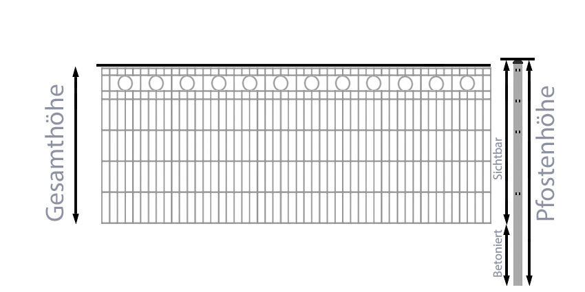 Alle Zaunpfosten vom Schmuckzaun / Doppelstabmattenzaun Kreis-Dekor Komplett-Set / Verzinkt / 101cm hoch / 7,5m lang werden immer mit einer Überlänge zum Einbetonieren geliefert. Die genaue Überlänge zum Einbetonieren der jeweiligen Pfosten können Sie der Beschreibung entnehmen.
