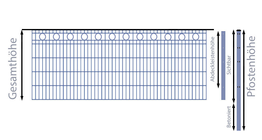 Das Einbetonieren der Zaunpfosten sorgt für die richtige Stabilität des Stabmattenzauns, daher sind die mitgelieferten Zaunpfosten auch immer wesentlich länger, als die Höhe der Doppelstabmatten - das ist auch in dem Schmuckzaun / Doppelstabmattenzaun Kreis-Dekor Komplett-Set mit Abdeckleisten / Anthrazit / 201cm hoch / 5m lang so. Bspw. sind die Zaunpfosten für einen 103cm hohen Stabmattenzaun insgesamt 150cm lang, so dass diese bis zu einer Tiefe von ca. 40cm einbetoniert werden können. Die Zaunpfosten für Doppelstabmattenzäune der Höhe 203cm sind sogar 260cm lang, entsprechend können diese noch tiefer einbetoniert werden. Wir empfehlen, diese Überlänge auch immer zum Einbetonieren zu nutzen, um einen optimale Stabilität für Ihren Gartenzaun zu gewährleisten.