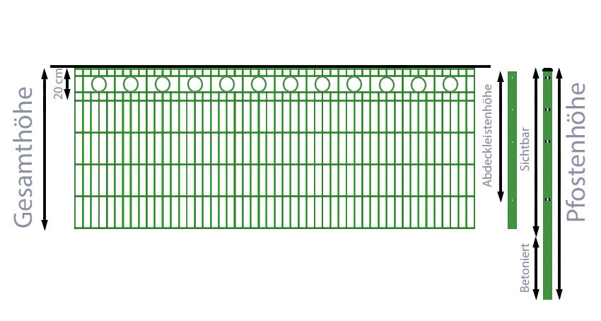 Das Einbetonieren der Zaunpfosten sorgt für die richtige Stabilität des Stabmattenzauns, daher sind die mitgelieferten Zaunpfosten auch immer wesentlich länger, als die Höhe der Doppelstabmatten - das ist auch in dem Schmuckzaun / Doppelstabmattenzaun Kreis-Dekor Komplett-Set mit Abdeckleisten / Grün / 181cm hoch / 95m lang so. Bspw. sind die Zaunpfosten für einen 103cm hohen Stabmattenzaun insgesamt 150cm lang, so dass diese bis zu einer Tiefe von ca. 40cm einbetoniert werden können. Die Zaunpfosten für Doppelstabmattenzäune der Höhe 203cm sind sogar 260cm lang, entsprechend können diese noch tiefer einbetoniert werden. Wir empfehlen, diese Überlänge auch immer zum Einbetonieren zu nutzen, um einen optimale Stabilität für Ihren Gartenzaun zu gewährleisten.