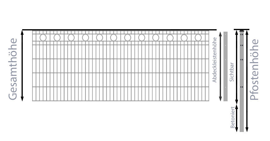Das Einbetonieren der Zaunpfosten sorgt für die richtige Stabilität des Stabmattenzauns, daher sind die mitgelieferten Zaunpfosten auch immer wesentlich länger, als die Höhe der Doppelstabmatten - das ist auch in dem Schmuckzaun / Doppelstabmattenzaun Kreis-Dekor Komplett-Set mit Abdeckleisten / Verzinkt / 201cm hoch / 97,5m lang so. Bspw. sind die Zaunpfosten für einen 103cm hohen Stabmattenzaun insgesamt 150cm lang, so dass diese bis zu einer Tiefe von ca. 40cm einbetoniert werden können. Die Zaunpfosten für Doppelstabmattenzäune der Höhe 203cm sind sogar 260cm lang, entsprechend können diese noch tiefer einbetoniert werden. Wir empfehlen, diese Überlänge auch immer zum Einbetonieren zu nutzen, um einen optimale Stabilität für Ihren Gartenzaun zu gewährleisten.