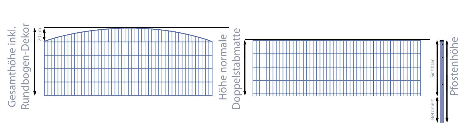 Das Einbetonieren der Zaunpfosten sorgt für die richtige Stabilität des Stabmattenzauns, daher sind die mitgelieferten Zaunpfosten auch immer wesentlich länger, als die Höhe der Doppelstabmatten - das ist auch in dem Schmuckzaun / Doppelstabmattenzaun 2-in-1 Bogen groß Komplett-Set / Anthrazit / 201cm hoch / 22,5m lang so. Bspw. sind die Zaunpfosten für einen 103cm hohen Stabmattenzaun insgesamt 150cm lang, so dass diese bis zu einer Tiefe von ca. 40cm einbetoniert werden können. Die Zaunpfosten für Doppelstabmattenzäune der Höhe 203cm sind sogar 260cm lang, entsprechend können diese noch tiefer einbetoniert werden. Wir empfehlen, diese Überlänge auch immer zum Einbetonieren zu nutzen, um einen optimale Stabilität für Ihren Gartenzaun zu gewährleisten.