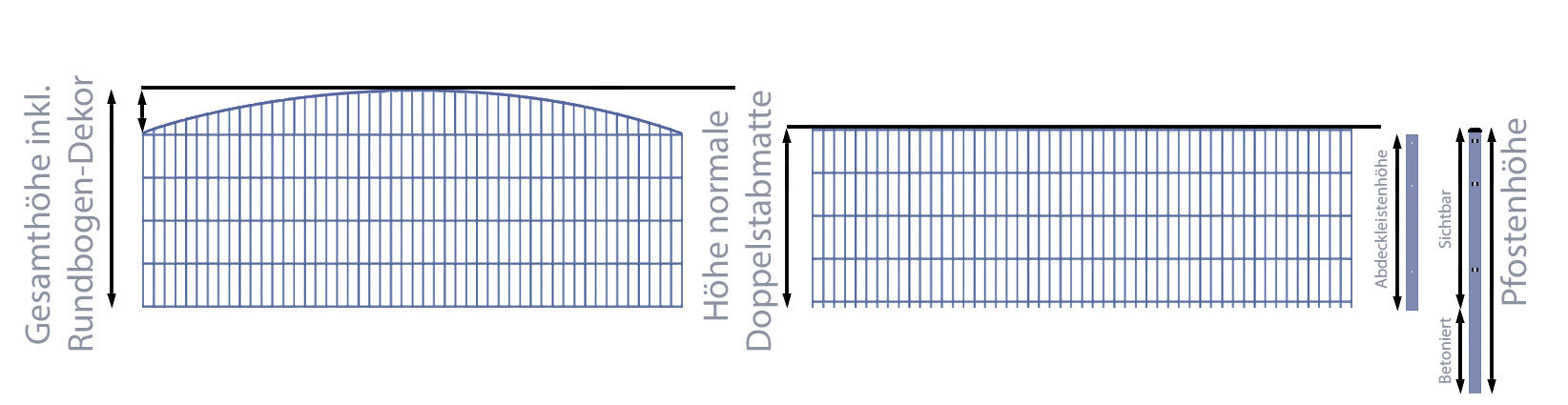 Alle Zaunpfosten vom Schmuckzaun / Doppelstabmattenzaun 2-in-1 Bogen groß Komplett-Set mit Abdeckleisten / Anthrazit / 121cm hoch / 17,5m lang werden immer mit einer Überlänge zum Einbetonieren geliefert. Die genaue Überlänge zum Einbetonieren der jeweiligen Pfosten können Sie der Beschreibung entnehmen.