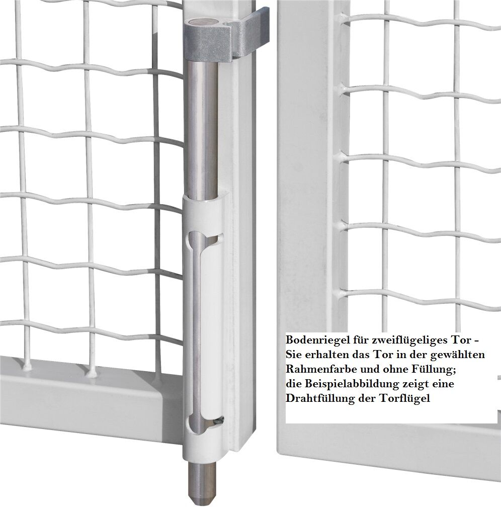 | Basic | - Torfüllung: 6/5/6mm-Doppelstabmatte - Rahmen: 30x30mm Quadrat-Stahlrohr - Torpfosten: 60x60mm-Quadrat-Stahlrohr | - Montagematerial - Bei 2-flügeligen Toren zus. Bodenriegel, Gegenblech, Anschlag | - Besonders günstiger Preis | ||||