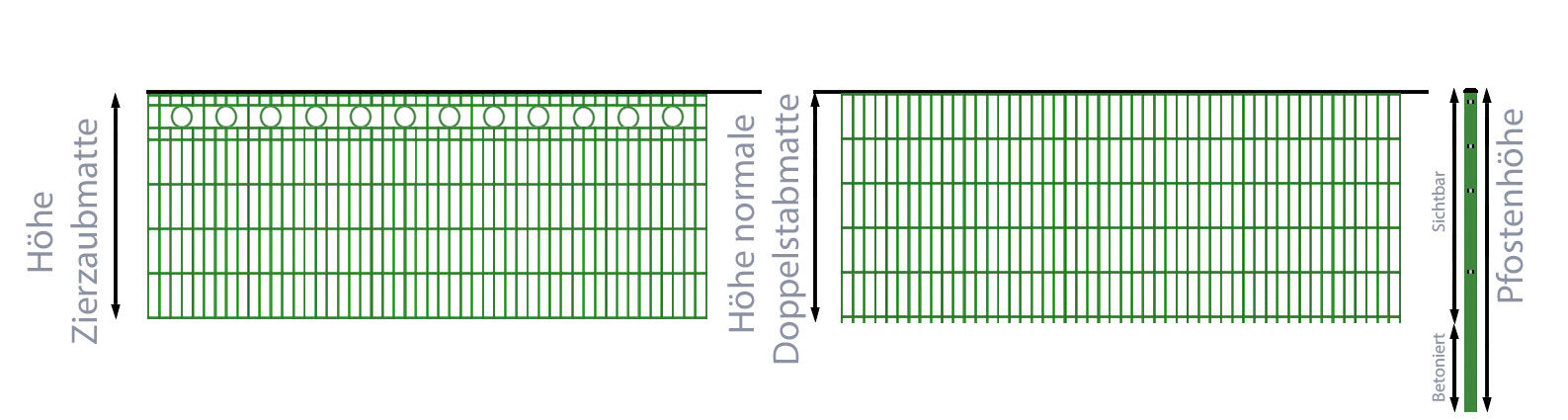 - 7 klassische Doppelstabmatten, Stärke 6 / 5 / 6 mm, Farbe Grün, Höhe 201 cm