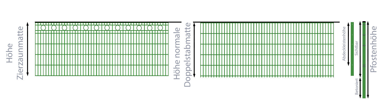 Wie bei unseren anderen Zaun-Komplett-Sets ist ebenso beim Schmuckzaun / Doppelstabmattenzaun 2-in-1 Kreis-Dekor Komplett-Set mit Abdeckleisten / Grün / 201cm hoch / 22,5m lang der Lieferumfang so gestaltet, dass Sie direkt mit der Montage beginnen können: Neben den in diesem Set enthaltenen 4 Schmuckzaunfeldern, 5 klassischen Doppelstabmatten und 10 Zaunpfosten (die eine Gesamthöhe von 263 cm haben, wobei 60 cm für das Einbetonieren gedacht sind), erhalten Sie hier ebenfalls das Montagematerial – alles in allem ein perfektes Rundum-Sorglos-Paket für Ihren neuen Doppelstabmatten-Schmuckzaun mit ganz neuem 2 in 1 -Kreis-Dekor. Auch die passenden Abdeckleisten sind in dem Schmuckzaun-Set enthalten: Auf insgesamt 10 Abdeckleisten in der Farbe Grün und der Länge 203 cm dürfen Sie sich freuen, so dass die Schrauben hinter den Abdeckleisten verschwinden.