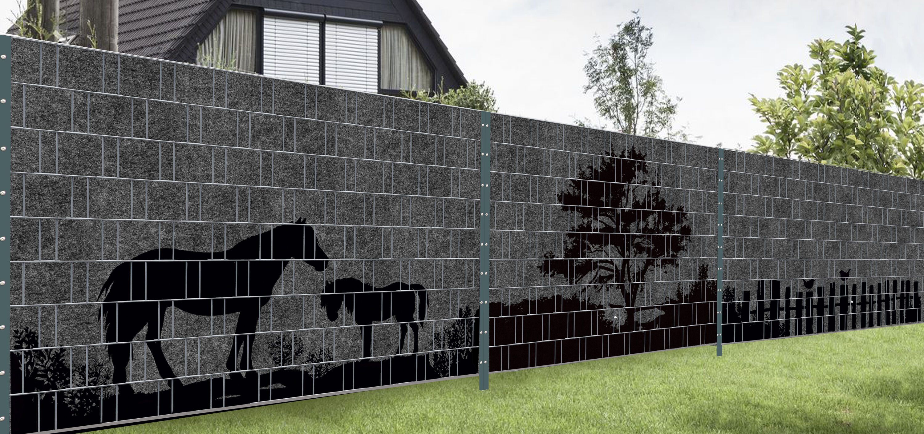 Sichtschutz, wie bspw. der Sichtschutz Premium Vliesoptik Motiv Landschaft / Pferde ist die ideale Ergänzung für den klassischen Doppelstabmattenzaun. Anders als bei vielen andere Sichtschutzstreifen erhält man mit dem Sichtschutz Premium Vliesoptik Motiv Landschaft / Pferde eine edle Vliesoptik mit einem Landschaft / Pferde-Motiv. So wird man nicht nur vor ungewollten Blicken geschützt, sondern wertet den kompletten Garten durch den individuellen Sichtschutz Premium Vliesoptik Motiv Landschaft / Pferde auf. Die Motive sind immer für ein Zaunfeld ausgerichtet, so dass man problemlos aus der großen Auswahl der anderen Sichtschutz-Produkte mit Motiv eine individuelle Gestaltung seines Gartenzaunes vornehmen kann. Innerhalb der einzelnen Themengebiete Stadt, Landschaft und Wildnis kann man die einzelnen Sichtschutzmotive ideal miteinander kombinieren, indem man sie rechts und linke aneinanderreihen kann.
