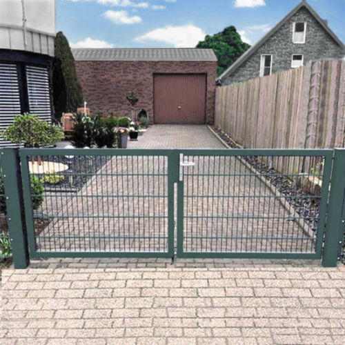 Zu dem hier gezeigten Tor führen wir perfekte passende Gartenzäune mit Höhe 160 cm und Farbe Grün / Moosgrün. Ob klassischer Doppelstabmattenzaun oder dekorativer Schmuckzaun, in Längen von 5 bis 200 m und Stärke 6/5/6, 6/6/6 oder 8/6/8 mm - wir haben das passende Komplett-Set für Sie.