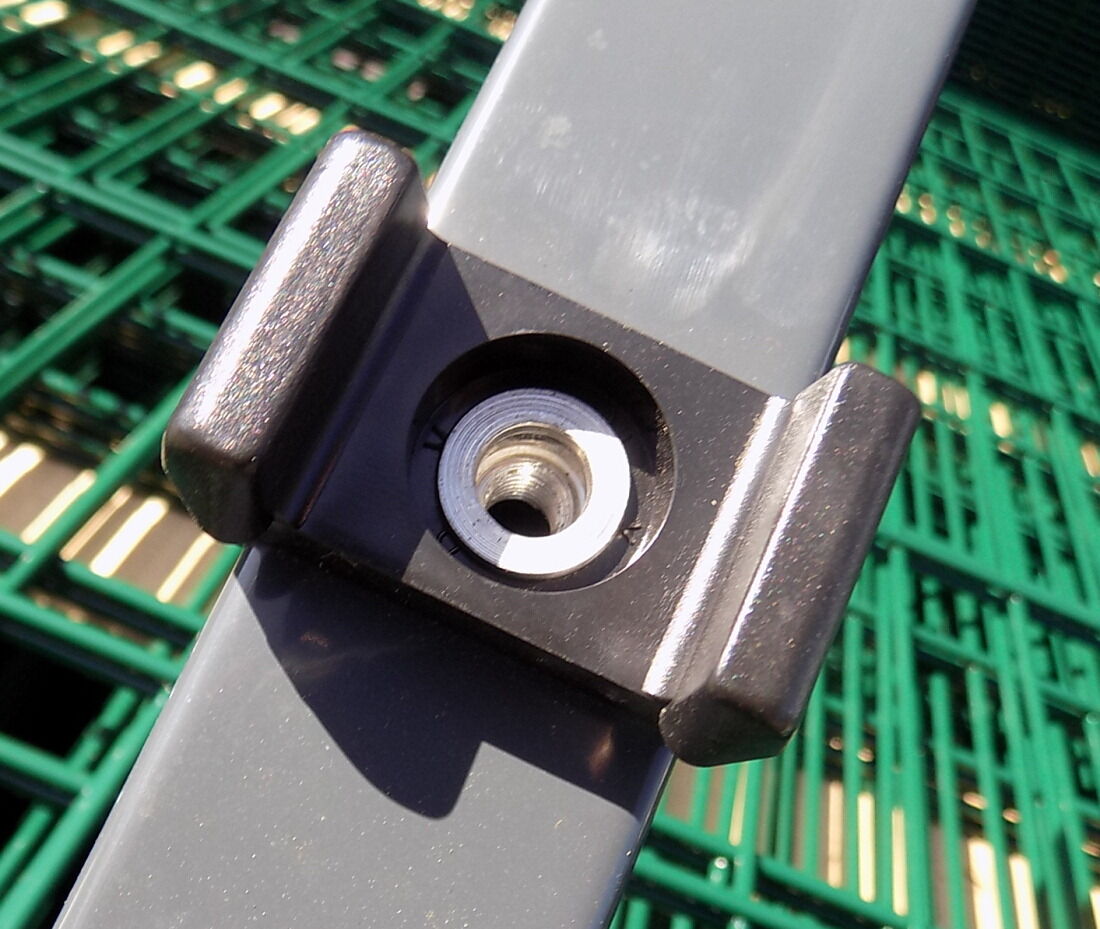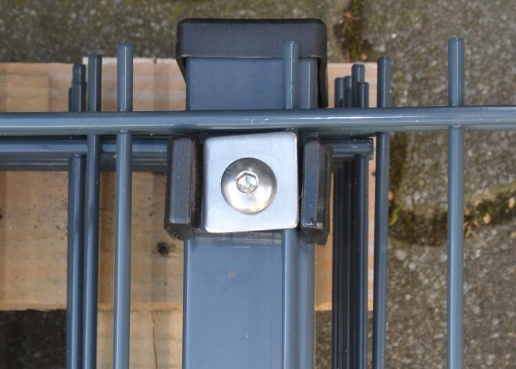 Die Montage der Doppelstabmattenfelder an den Eckpfosten erfolgt identisch wie bei den normalen Zaunfeldern. Der Unterschied ist, dass hier die beiden Zaunfelder nicht an der gleichen Seite es Zaunpfostens montiert werden, sondern um 90° versetzt. Entsprechend verfügen die Eckpfosten für Stabmattenzäune auch über Auflageböcke an zwei Seiten. Hier werden die Zaunfelder eingehangen, mit den Edelstahl-Klemmplatten fixiert und dann mit ebenso im Lieferumfang enthaltenen Edelstahl-Schrauben per Innensechskant-Schlüssel fixiert.