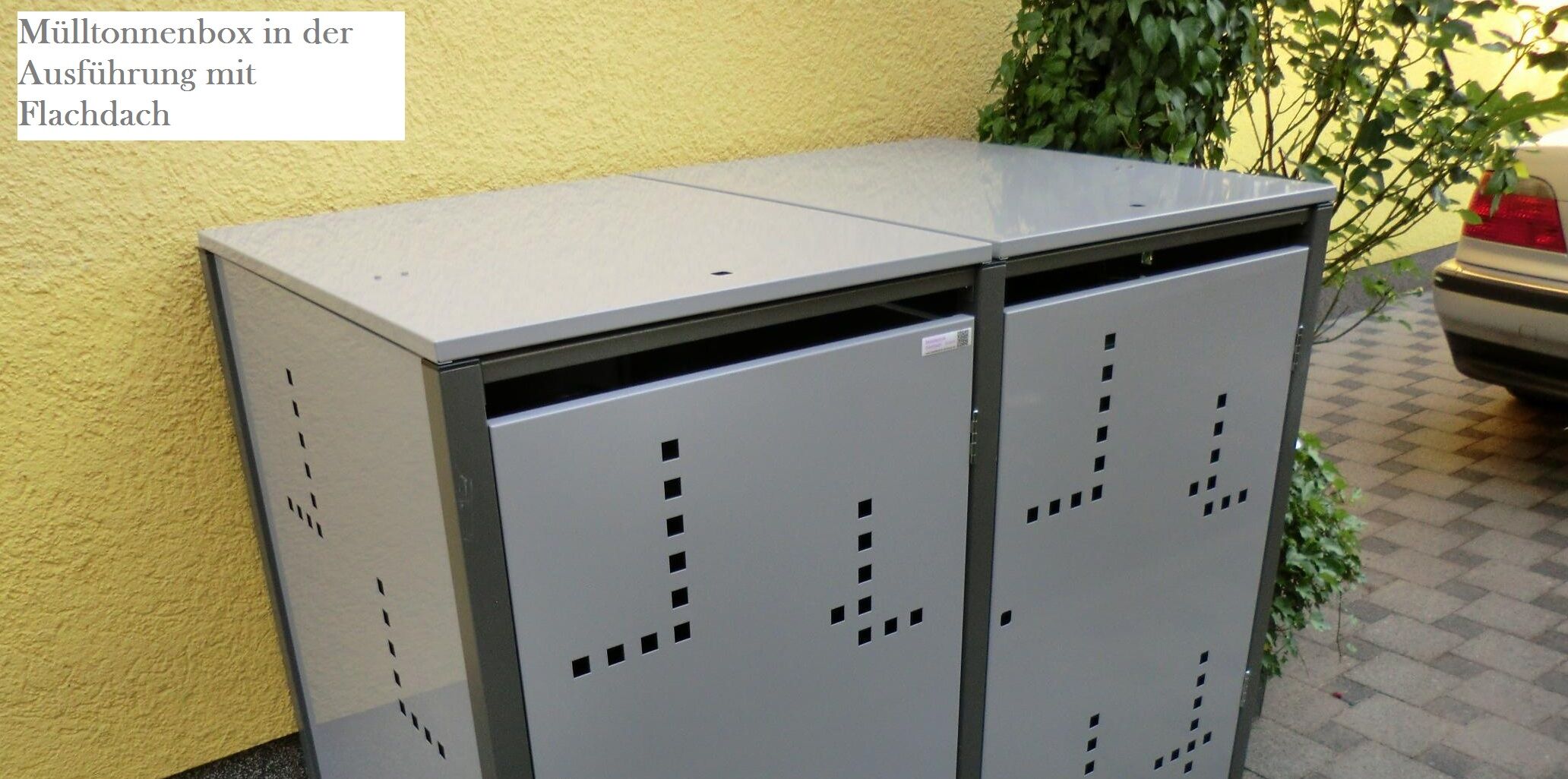 Zusätzlich bieten wir auch anthrazitfarbene Metall-Mülltonnenboxen mit einer roten Fronttür an, Premium-Mülltonnenumhausungen mit Edelstahl-Front sowie Modelle mit einer Front aus Edelholz. Bei diesen Metallmülltonnenboxen sind keine Stanzungen möglich.