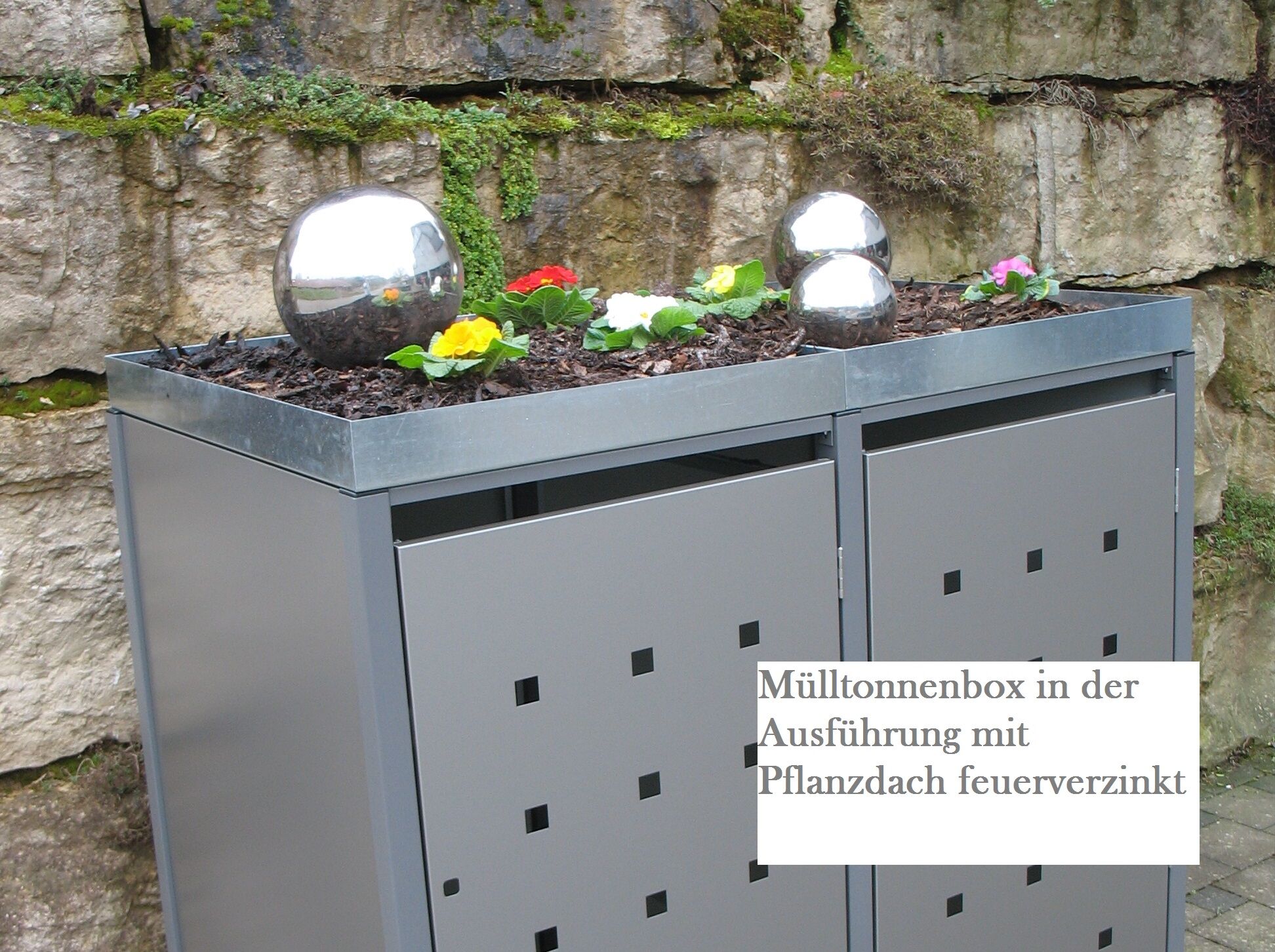 Wählen Sie als Dach für Ihre Premium Metall Mülltonnenbox Anthrazit (RAL 7016) für 4 120l Mülltonnen (Größe S) ein Pflanzdach Korpusfarbe, erhalten Sie eine Pflanzschale, die in der Farbe Anthrazit (RAL 7016) lackiert und über jeder Mülltonnenbox platziert ist. Tipp: Für ein besonders leichtes Befüllen empfehlen wir hier ein Kippbox-Set als Zubehör zu wählen, um die Mülltonne nach vorne kippen zu können, so dass das Befüllen leichter fällt. Für die Premium Metall Mülltonnenbox Anthrazit (RAL 7016) für 4 120l Mülltonnen (Größe S) benötigen Sie 4 Kippbox-Sets. Zu Kippbox-Sets für Mülltonnenboxen. Beachten Sie dabei, die Auswahl der korrekten Größe der Mülltonnenboxen. Informationen dazu finden Sie hier: Auswahl der passenden Größe der Mülltonnenboxen.